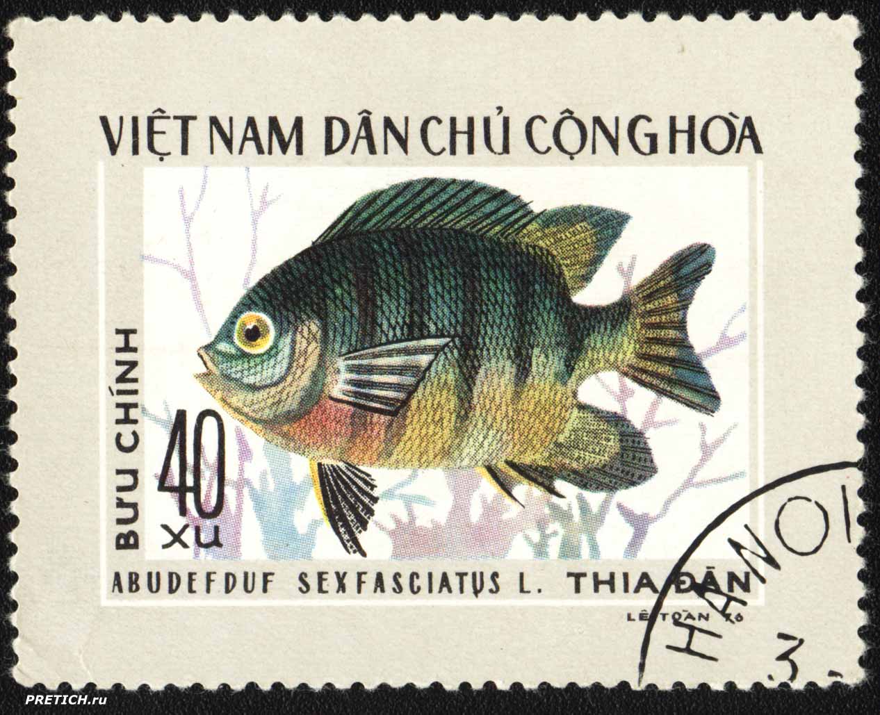 Почтовая марка Вьетнама: Abudefduf sexfasciatus L. 1976. Viet Nam