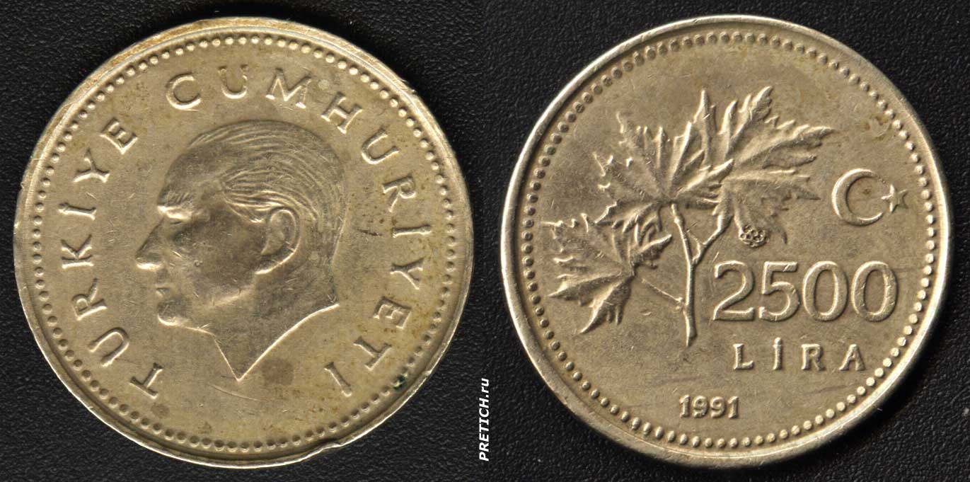 Turkiye Cumhuriyeti - 2500 Lira 1991. 2500 турецких лир 1991 года, изображен Ататюрк и на обороте указан номинал и листья платана с семенами. Гурт гладкий с надписью TURKIYE CUMHURIYETI. Чеканилась с 1991 по 1997 год. Изъята из обращения 1 января 2005 г. Материал медно-никелевый сплав.