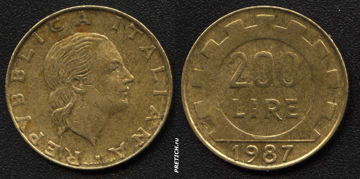 Pepublica Italiana. M. VALLUCCI - 200 Lire 1987. Сонета в 200 итальянских лир 1987 года. Изображение в профиль - Мария Монтессори (?).