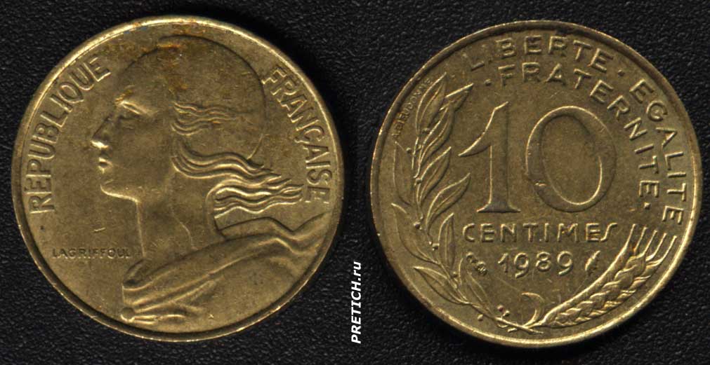 10 Centimes 1989, Liberte. Egalite. Fraternite. Republique Francais. Французская монета в 10 сантимов, 1989 года, с профилем Марианны. Изготовлена из сплава меди, алюминия и никеля.