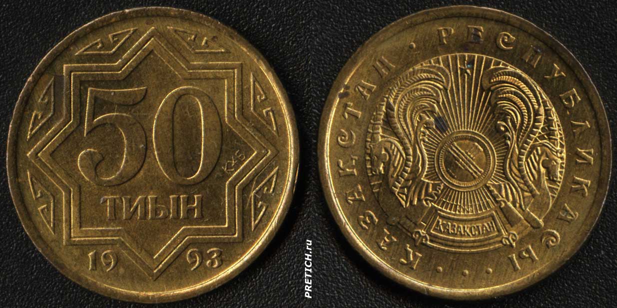 50 тиын, 1993 - металлическая монета республики Казахстан. Монета желтого цвета, изготовлена из сплава Л-80 (латунь). с 7 февраля 2001 года металлические тиыны изъяты из оборота.