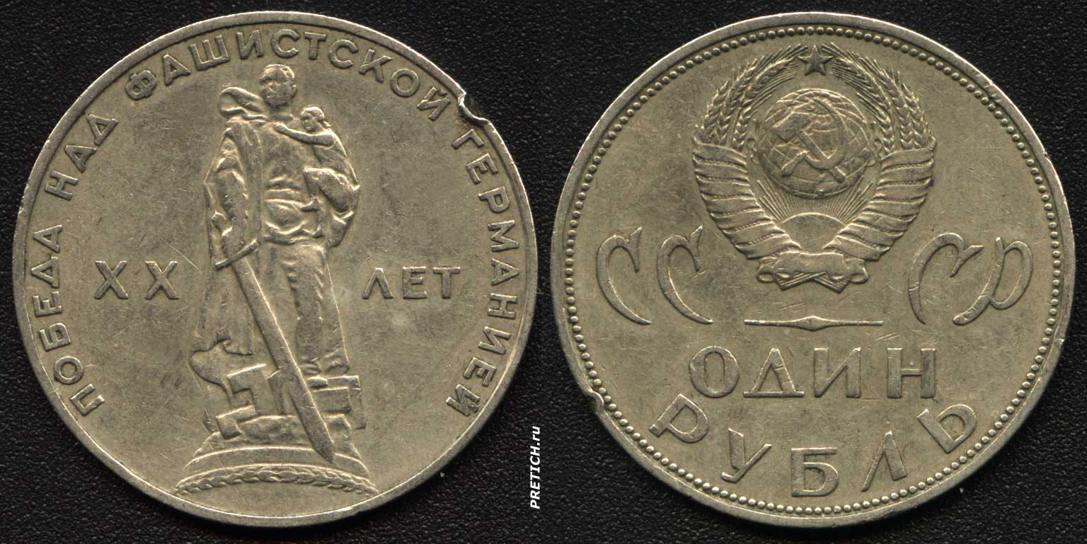 Один рубль, СССР - ХХ лет, Победа над фашистской Германией. Монета была выпущена 28 апреля 1965 года, тиражом в 60 млн. экземпляров (в том числе 11250 штук специально для нумизматов). Изготовлена из медно-никелевого сплава. Была в обращении до самого конца существования СССР.