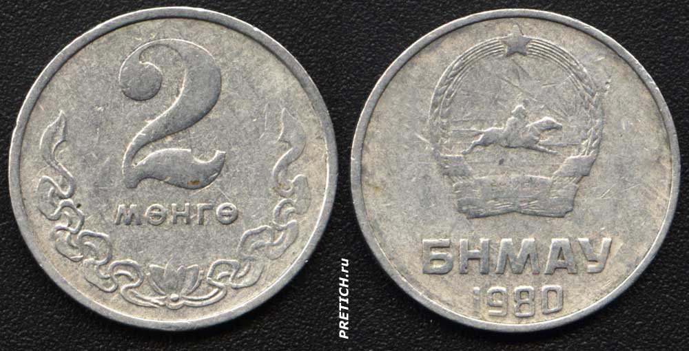 2 менге, 1980, БНМАН - монета в две менге Монгольской народной республики, материал - алюминий.