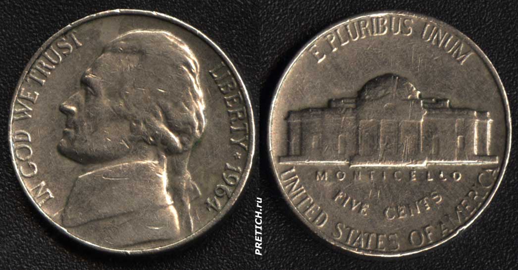 Five Cents. United States of America. Monticello. 1964 - монета в 5 центов, США.