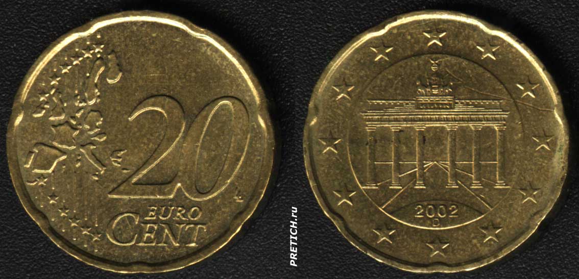 20 EURO Cent. 2002. Германия. Металлическая монета желтого цвета - латунь.