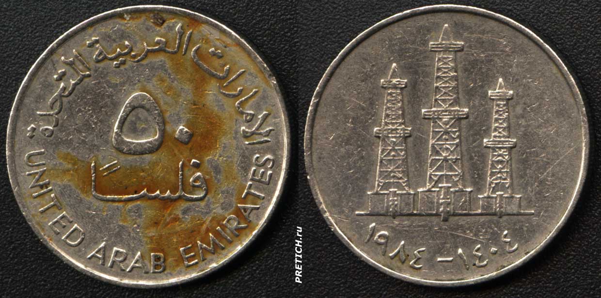 50 филсов. Монета ОАЭ - United Arab Emirates. Медно-никелевый сплав.