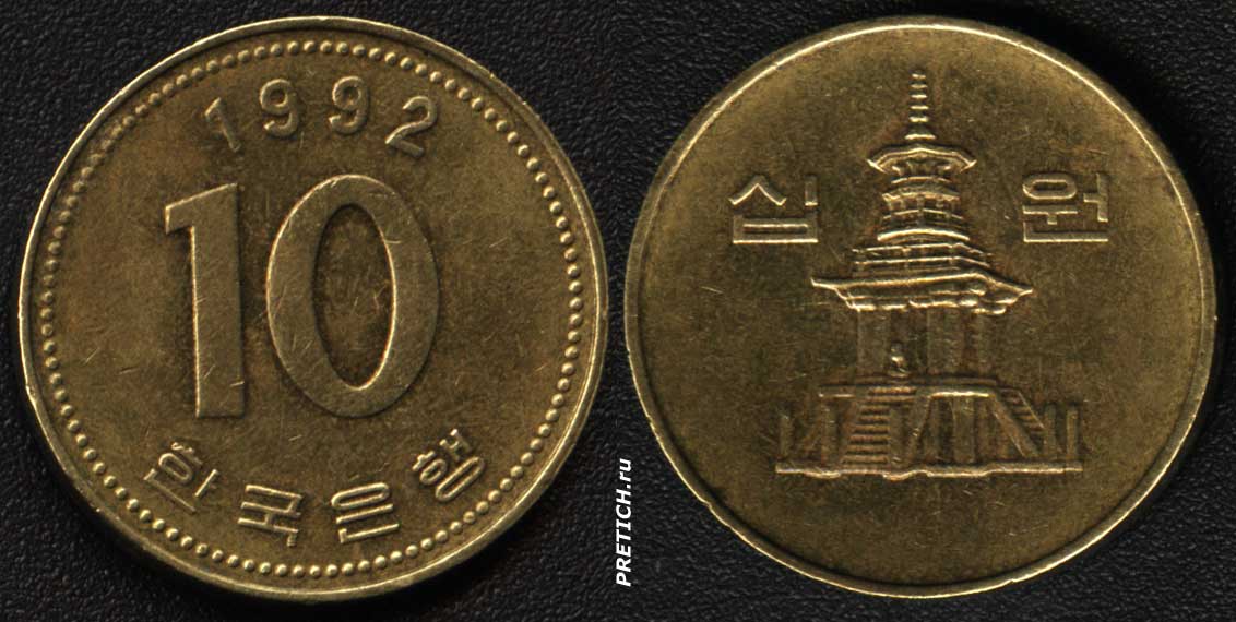 10 вон. 1992. Монета Южной Кореи. Материал - алюминий с медным покрытием.