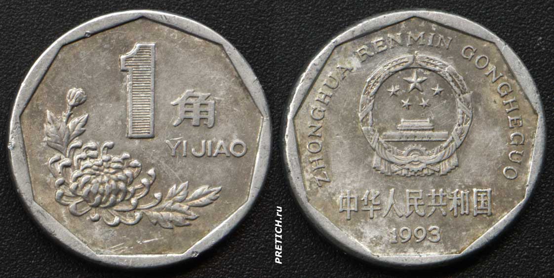 1 YI JIAO. 1993. ZHONGHUA RENMIN GONGHEGUO - китайская монета в 1 цзяо. Материал - алюминий.