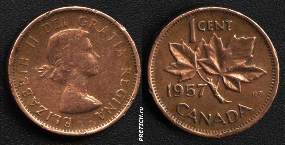 1 Cent. 1957. Canada. Elizabeth II Dei Gratia Regina. Канадская монета достоинством в 1 цент, материал - бронза.