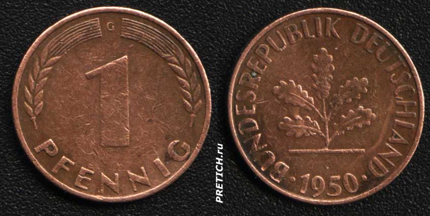 1 PFENNIG. 1950. Bundesrepublik Deutschland - западногерманская монета в 1 пфенниг. Материал - сталь с медным покрытием.