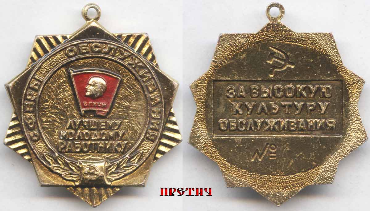 На аверсе в центре значок ВЛКСМ и ниже его надпись "Лучшему молодому работнику", по кругу надпись "Сферы обслуживания.
