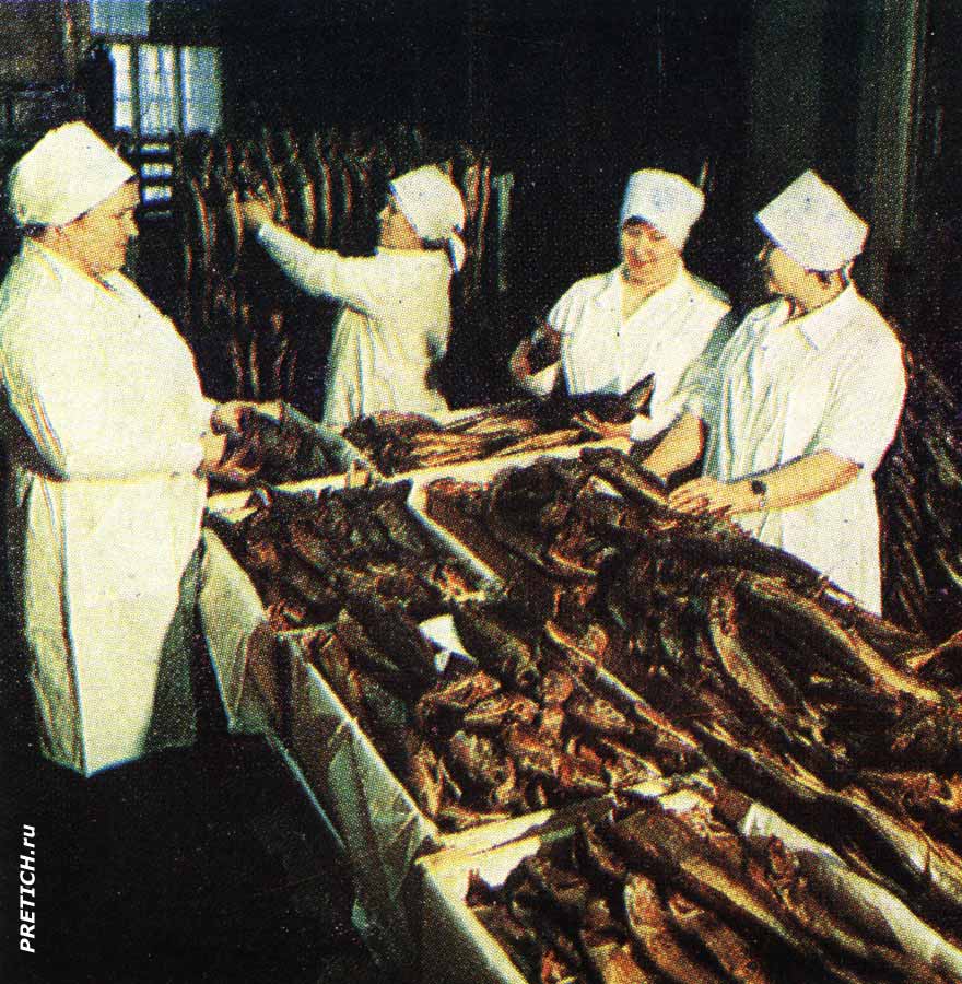 Ручьевский рыбокомбинат поставляет к столу ленинградцев копченую рыбу. СССР. Начала 1980-х годов.