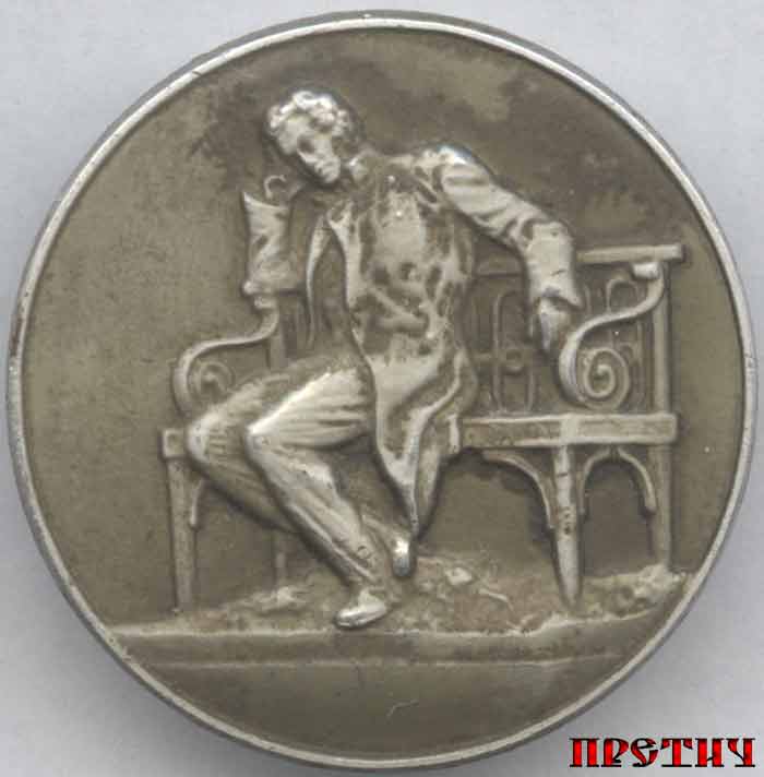Неизвестный металлический знак круглой формы с изображением поэта А.С. Пушкина сидящим на скамейке. Откуда этот знак не известно.
