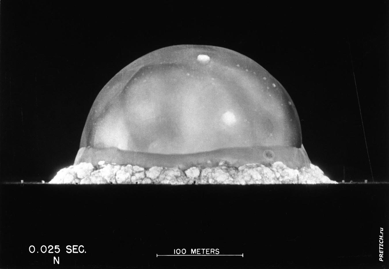 Расширяющийся огненный шар и ударная волна взрыва Тринити, через 0,25 секунды после детонации. 16 июля 1945 года (министерство обороны США)