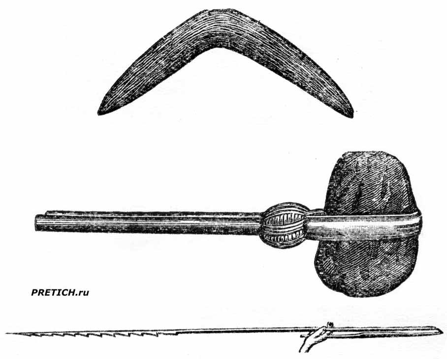 Бумеранг, каменный топор с деревянной рукояткой, метательная дощечка с гарпуном.