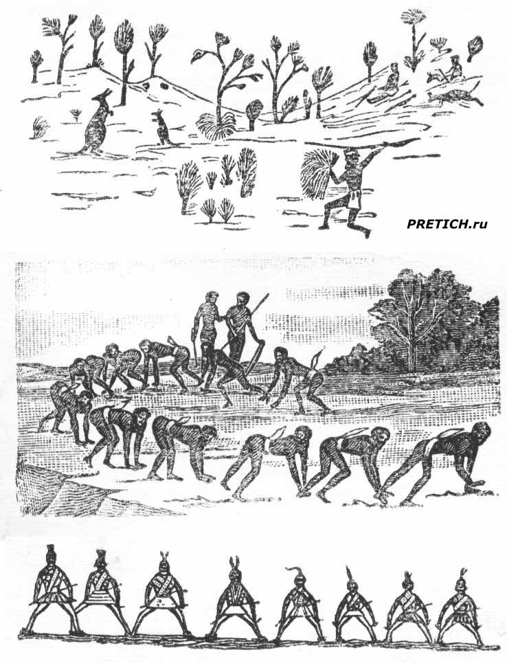 Рисунок австралийцев - охота на кенгуру. Церемониальная пляска - т.н. собачий танец. Рисунок австралийцев - изображение церемониального танца.
