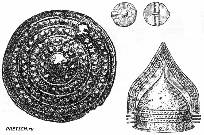 Бронзовый щит - из Темзы, Англия. Бронзовая каска - Италия. Бронзовая пуговица спереди и сзади - Франция. Бронзовый век.