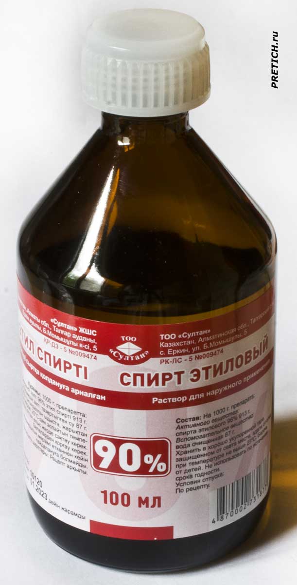 Спирт этиловый - раствор для наружного применения. Состав: на 1000 г. препарата: спирта этилового 96% 913 г. Вспомогательное вещество - вода очищенная 87 г. Отпуск по рецепту... вот такой маразм у нас в Казахстане. Производитель ТОО "Султан" - Казахстан, Алматинская обл. с. Еркин.