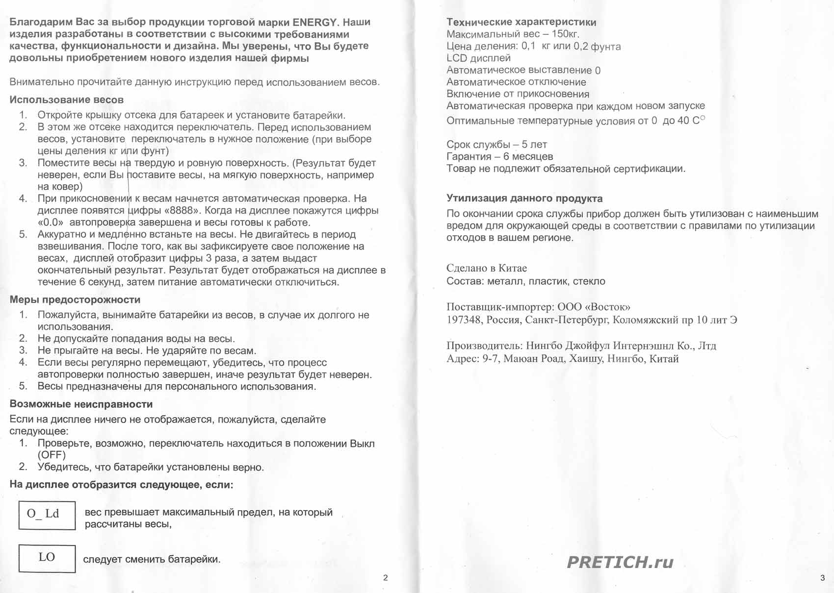 Весы Energy EN-402 имеют бумажную инструкцию - она простая, но полезная. Она приведена во второй части этой статьи.
