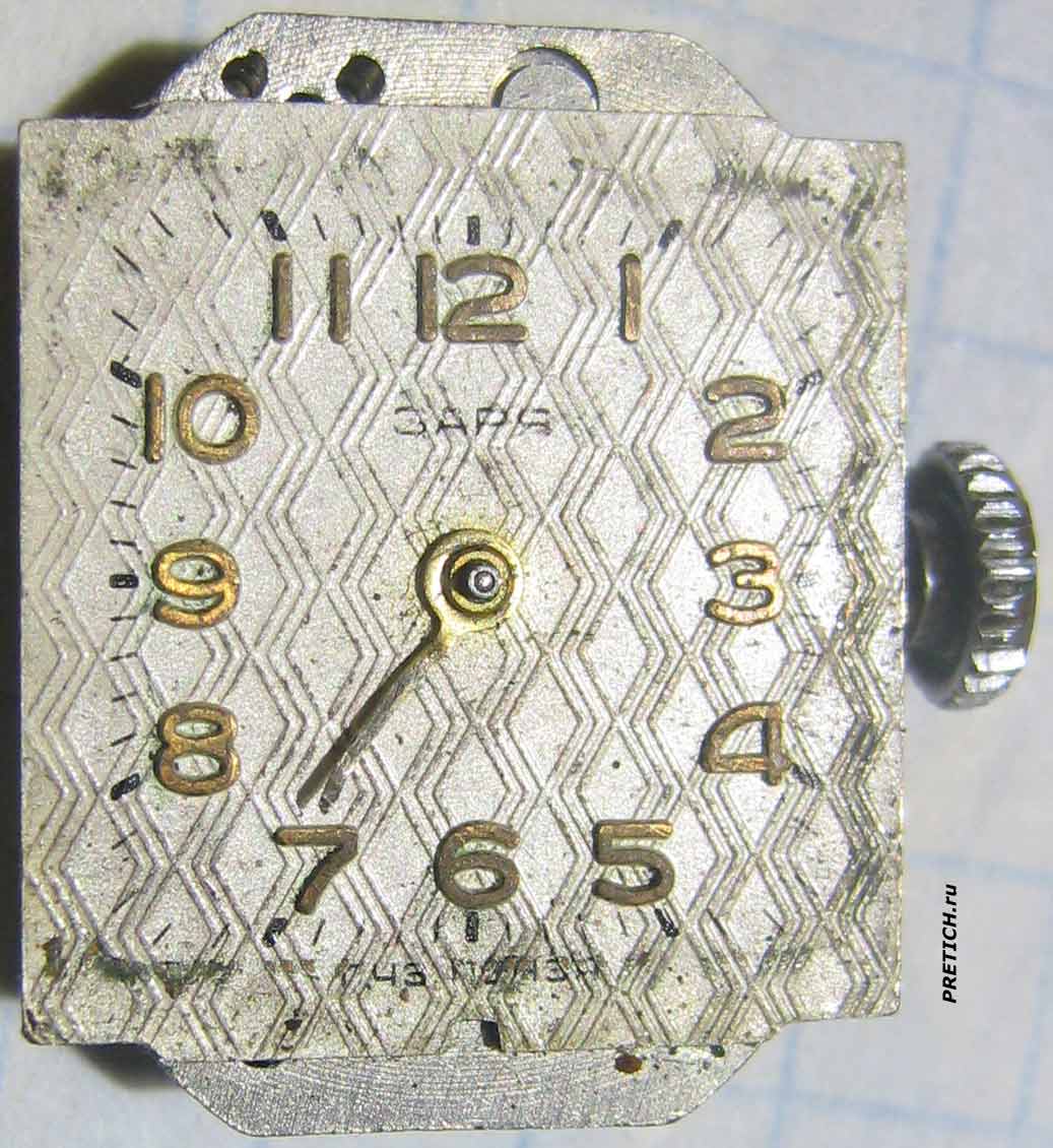 Циферблат серебристо-белый, с рельефным узором. Цифры арабские и тоже выступающие, покрыты как бы золотом... Стрелка в моем экземпляре сохранилась всего одна, и она тоже желтого цвета... Над стрелкой черной краской напечатано ЗАРЯ, а в самом низу - ГЧЗ Пенза.