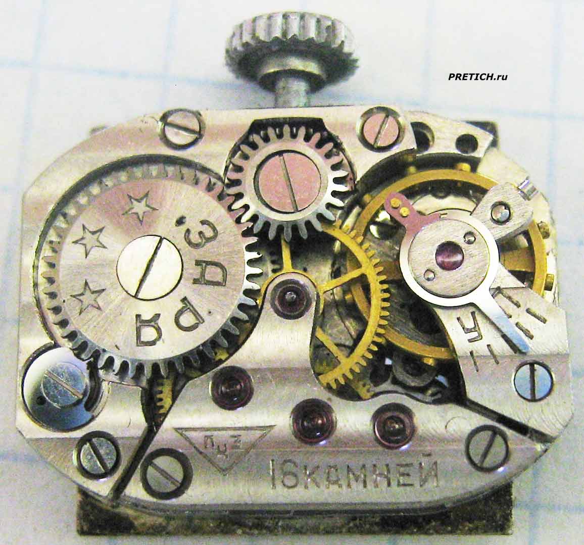 На шестерне выгравирована надпись SEVENTEEN 17 JEWELS 1301.2 - последнее название механизма, или Заря-1601.2