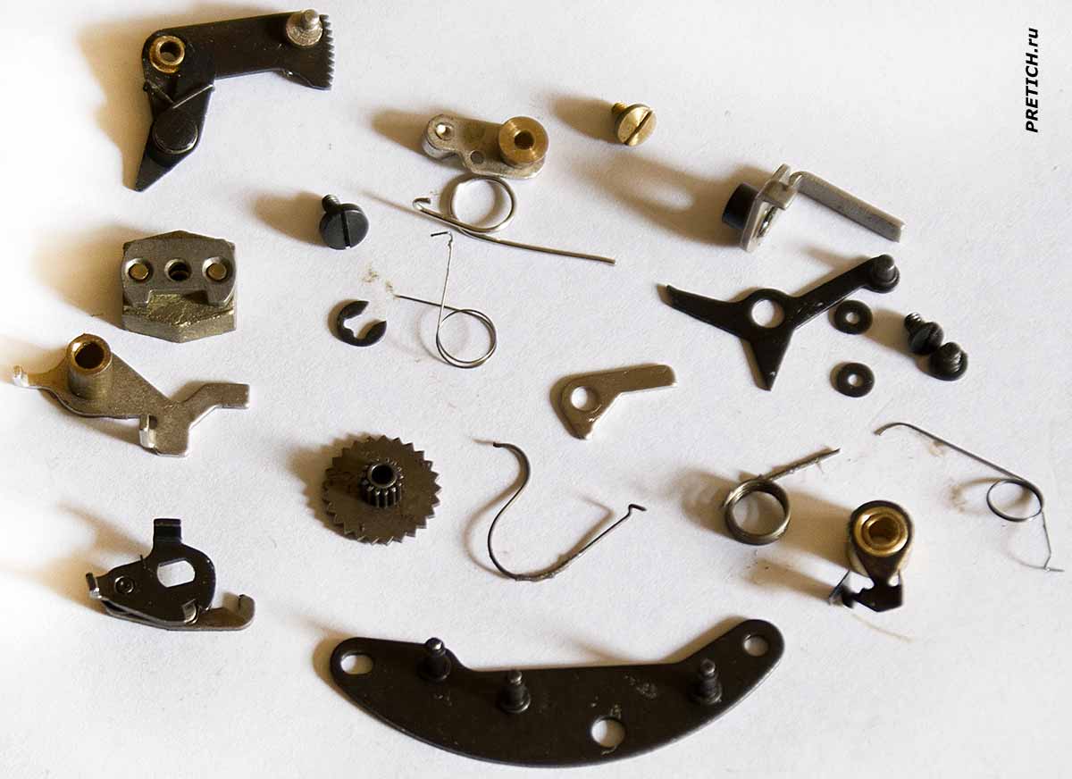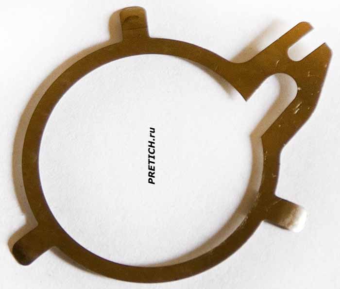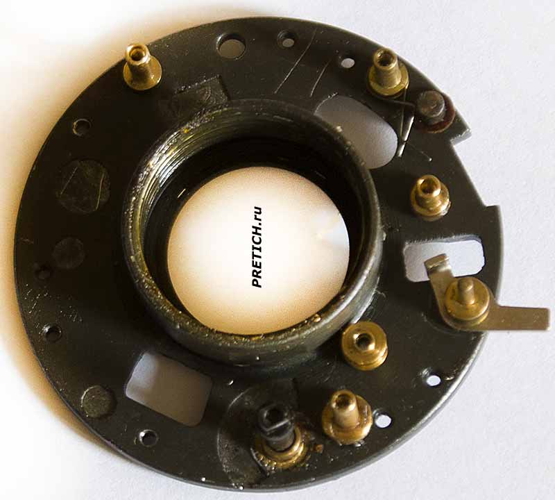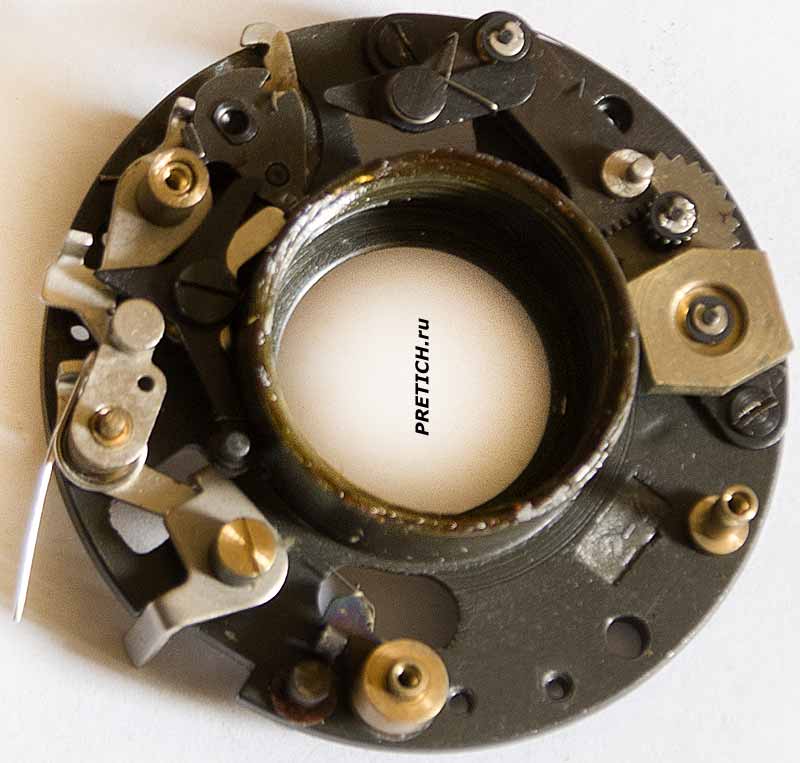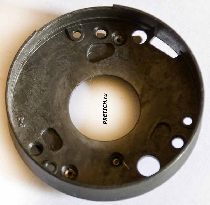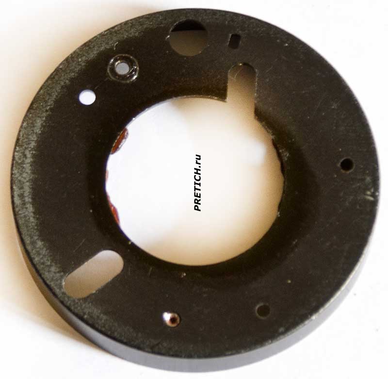 Это диск из алюминия же, на нем спусковой рычаг затвора с пружиной, с обратной стороны мы видим контакты для синхронизатора.