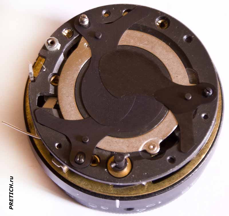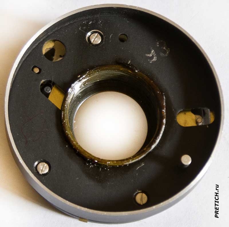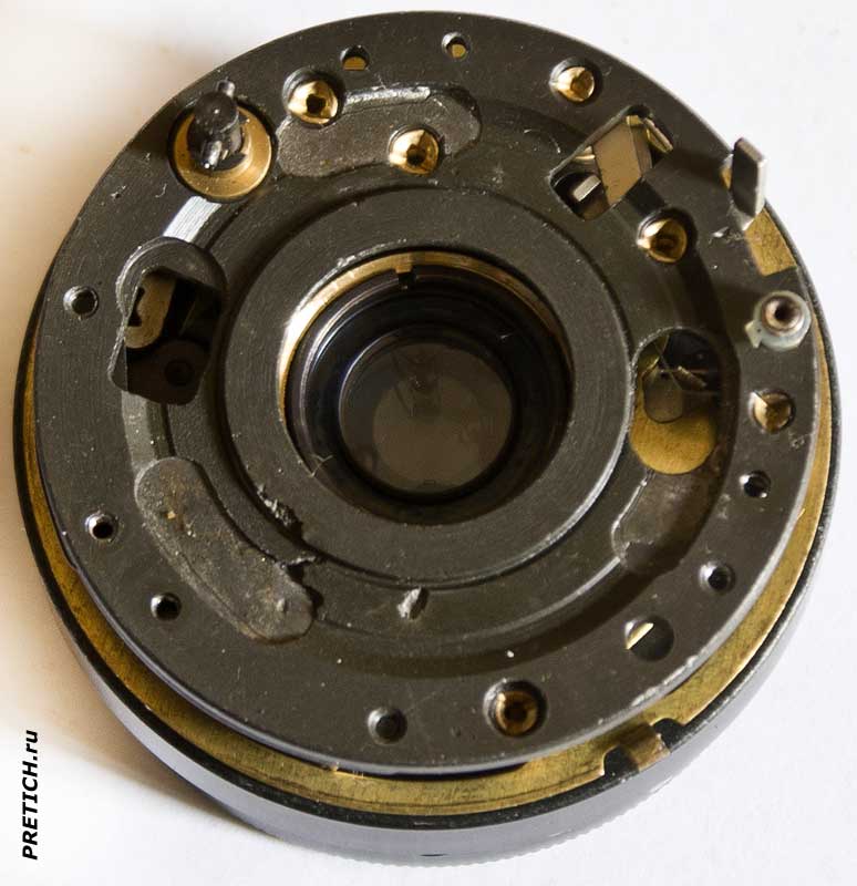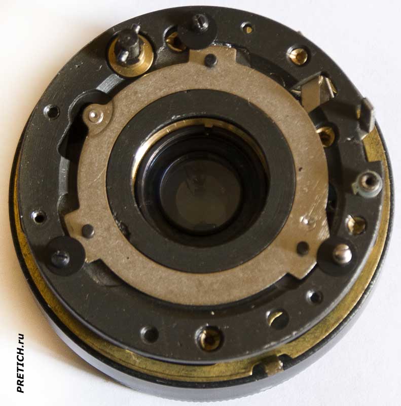 А здесь мы уже приступаем к разборке самого затвора - объектив тот же, что и на Смене-8М, но затворы разные... Внешнее кольцо объектива - выкручиваем четыре винта и снимаем. Алюминиевый диск со шкалами диафрагм - просто приклеен.