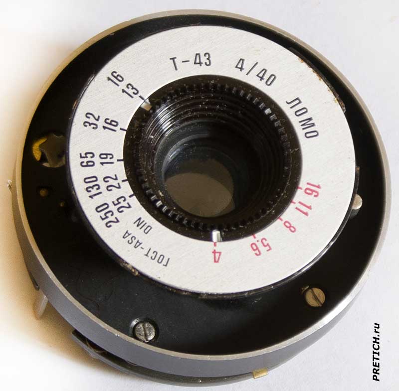 Вот сам объектив - на внешней стороне пластмассовая несъемная насадка (я ее просто сломал). Пластмассовая втулка - ею выставляем размер диафрагмы... Сам объектив Т-43 4/40 ЛОМО, как уже говорил, совершенно идентичен тому, который я разбирал в прошлой статье о Смене-8М, потому повторяться не буду.