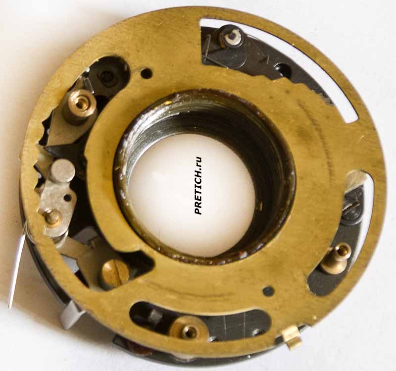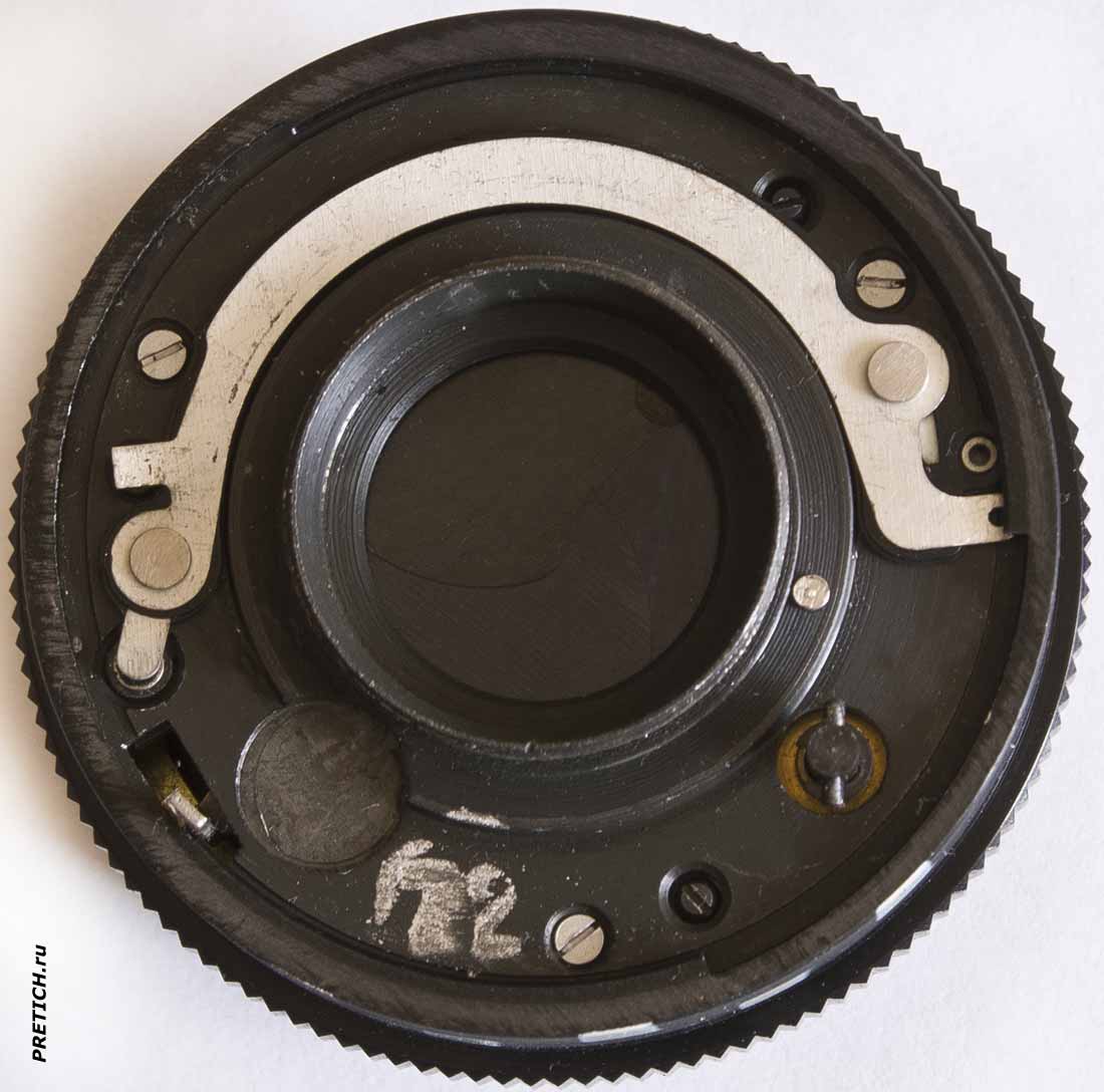 Обратная сторона объектива Т-43 4/40. Алюминиевая отливка, спусковой рычаг с пружиной... выступающие контакты - идут на синхронизатор вспышки. Выступающий шток с шестерней - через нее и происходит взвод затвора.