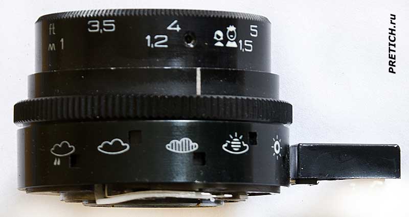 Внешний вид объектива вы можете видеть на фото. На передней части, помимо маркировки, кольцо регулировки диафрагмы и шкала диафрагм, и шкала светочувствительности пленки. По кругу идут: шкала дистанций, шкала символов погоды, и кольцо установки, шкала выдержек... Сбоку спусковой рычаг. Характеристики и прочие данные вы можете найти в инструкции по эксплуатации, поэтому я на этих моментах останавливаться не буду. Основные материалы, из которых изготовлен объектив - алюминий, сталь, латунь, пластмасса, ну и конечно стекло оптики.